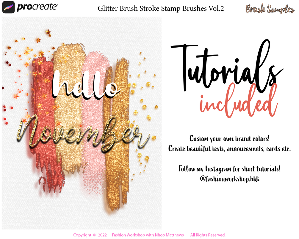 ✨This unique brush set was first published in November 2022.✨These brushes work with Procreate App on iPad only and recommend using with ApplePencil for sensitive pressure brushes and multicolor effect. If your stylus doesn't work with pressure sensitive in Procreate app, the multicolor brush won't work. The glitter stamp brushes work on light background and dark background. You don't need to create shadow or any overlay :)