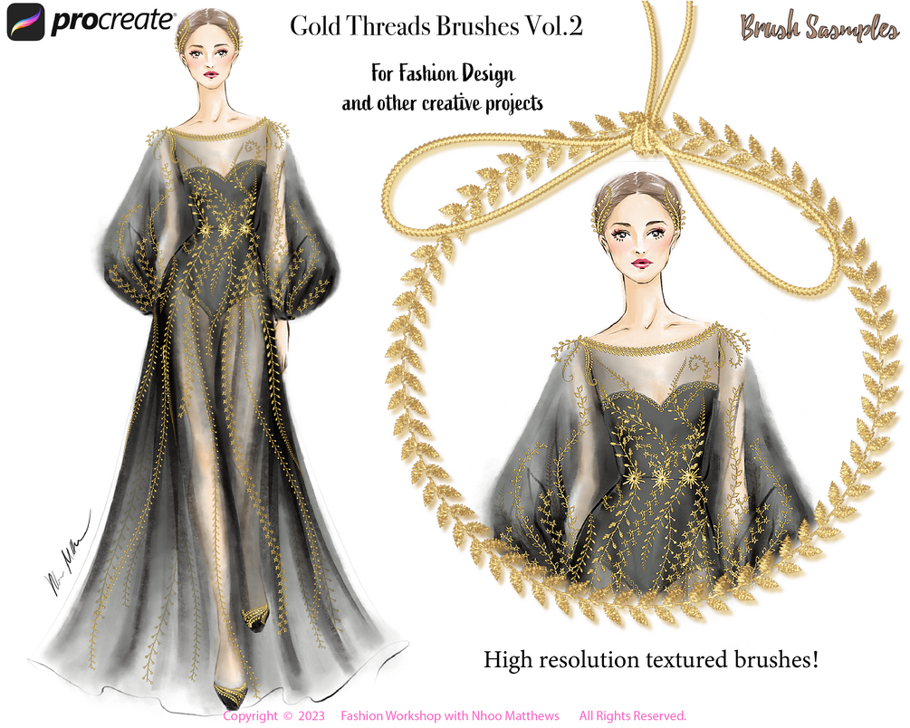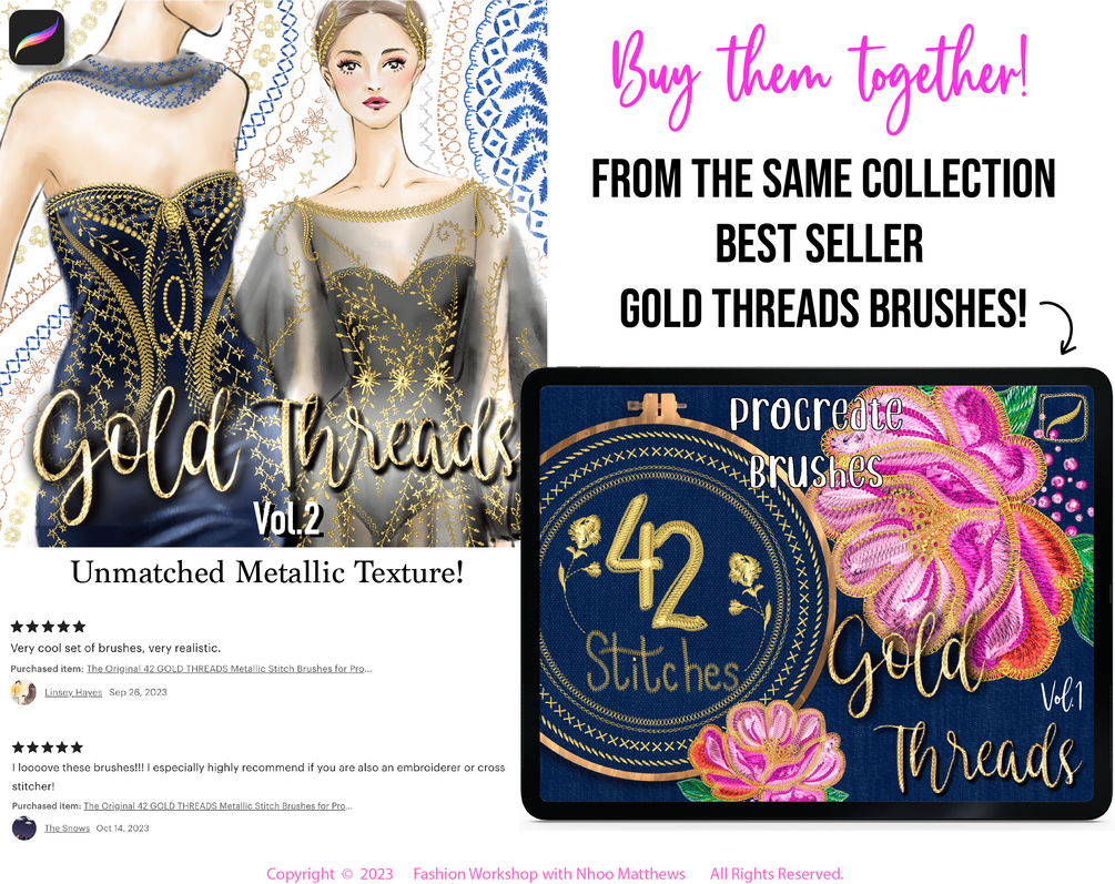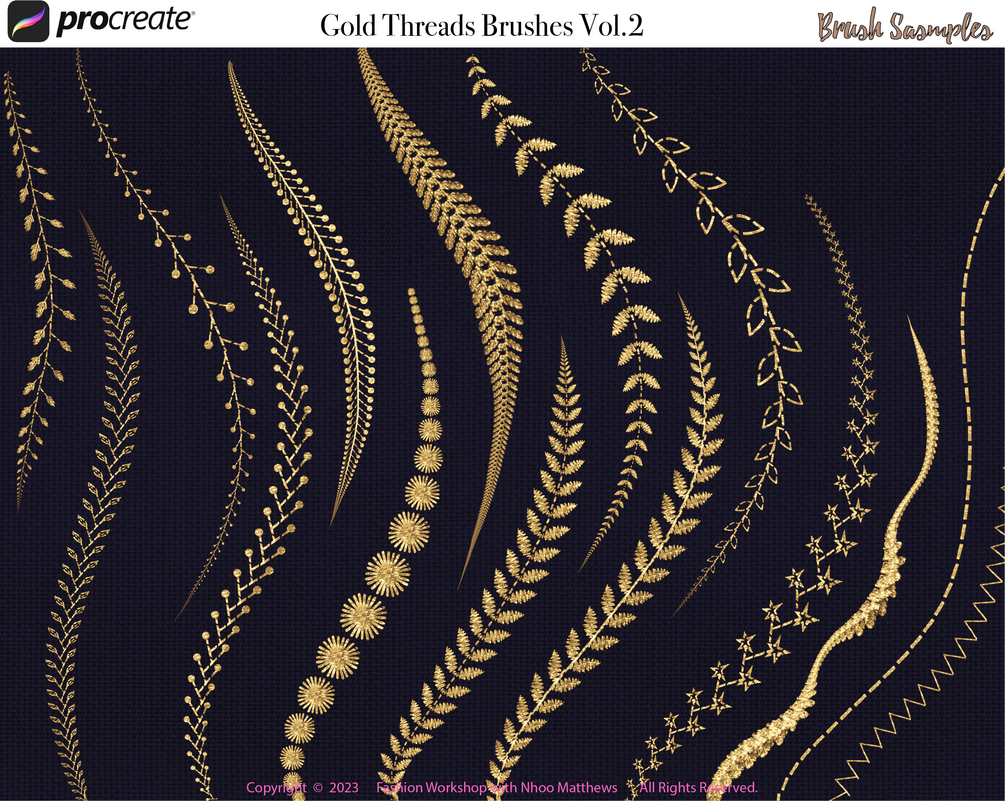 The Original 49 GOLD THREADS Metallic Stitch Brushes for Procreate App. Shiny Fashion Embroidery, Leaf, Floral, Folk Patterns. VOL.2