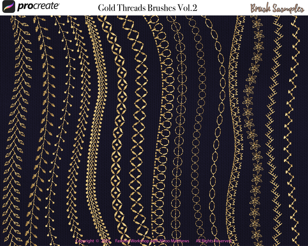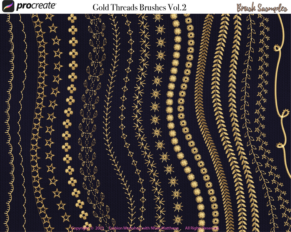 The Original 49 GOLD THREADS Metallic Stitch Brushes for Procreate App. Shiny Fashion Embroidery, Leaf, Floral, Folk Patterns. VOL.2