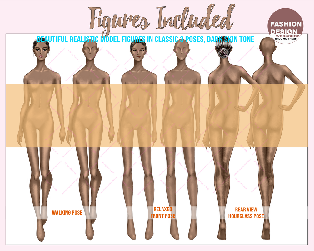 Make your design presentation look professional and awesome with these beautiful realistic model figures. These model colored figures are carefully rendered with shading and hi-light to show each skin tone color at their best. It's perfect for clothe designs that show a lot skin or see-thru such as lingerie, swimwear, bridal-evening gowns, or even casual designs.