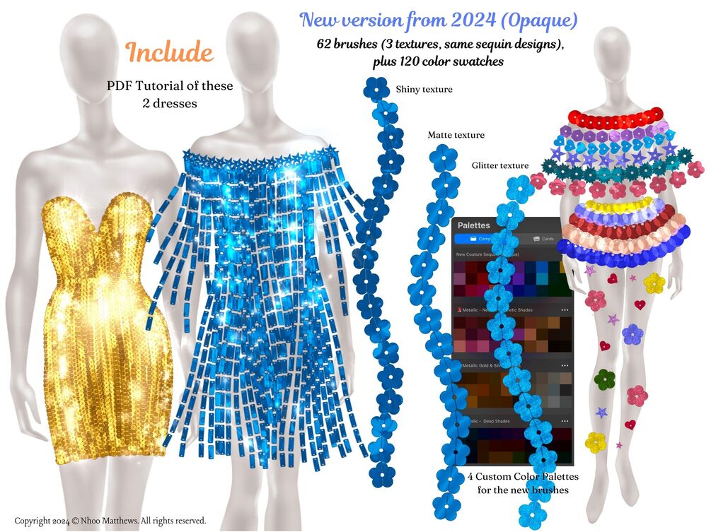 New Couture Sequin Brushes Updated! Additional 62 Opaque brushes + tutorial are included. You will get the original version (73 brushes) and the new one all together 135 brushes!