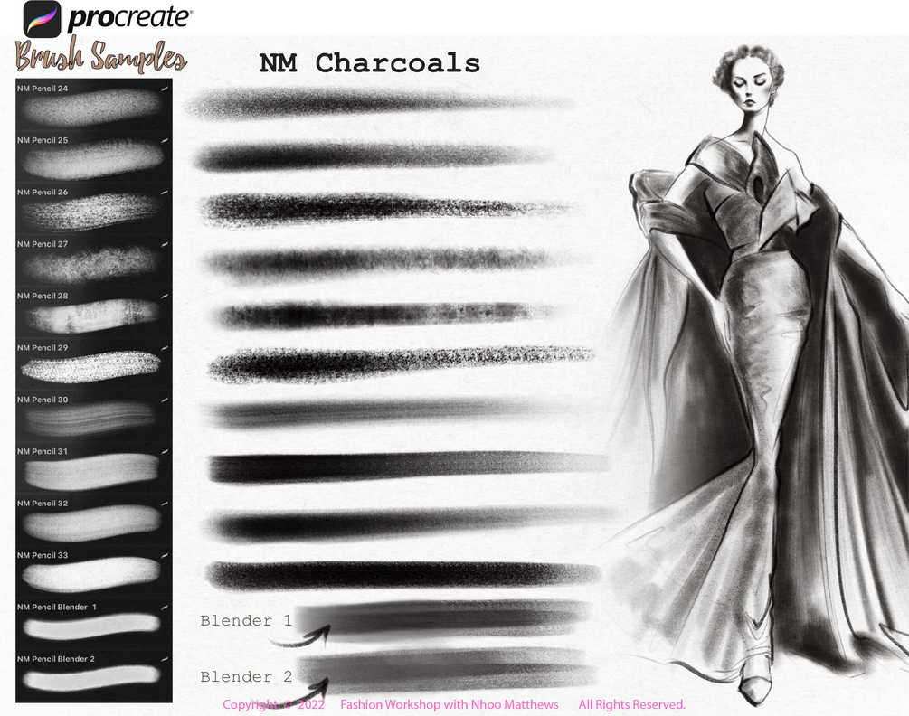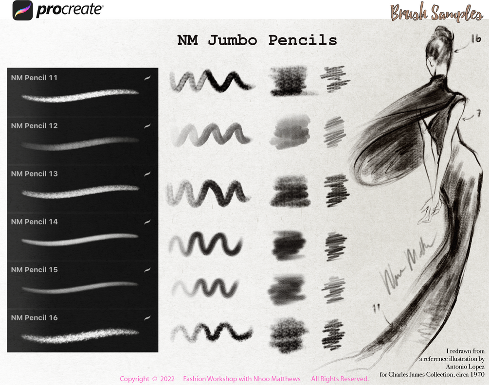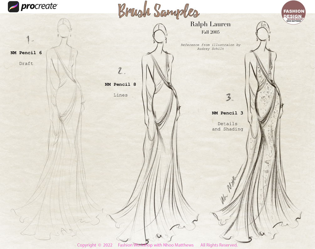 This brush pack was custom made especially for fashion drawing because that is my specialty 🥰 I spent some weeks experimenting these brushes by working on different types of fashion illustrations and compared the brush textures to my artwork archive from fashion school days. There are various textures and pencil heads for sketching, include technical pencil, classic graphite pencils, and colored pencils.