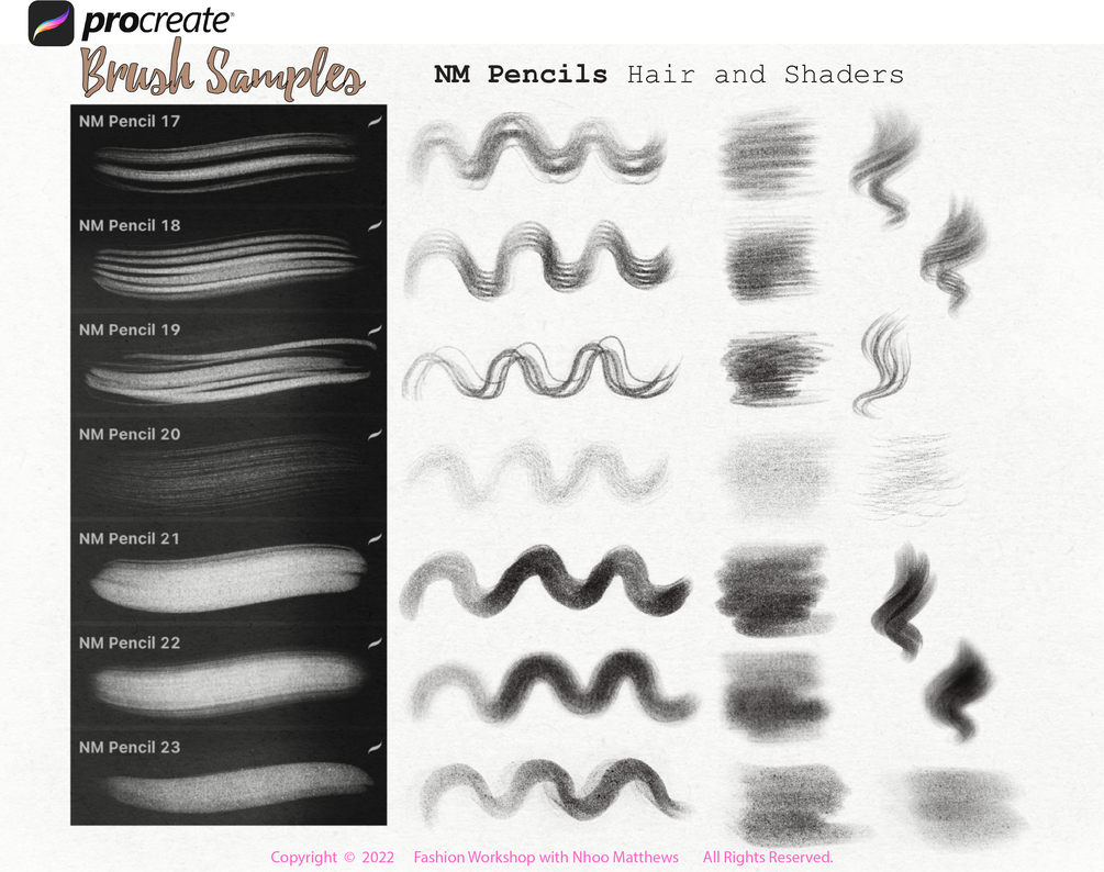 Includes sketch pencil brushes, jumbo pencils brushes, hair texture pencil brushes, charcoal and shader brushes, and 2 pencil blender brushes.