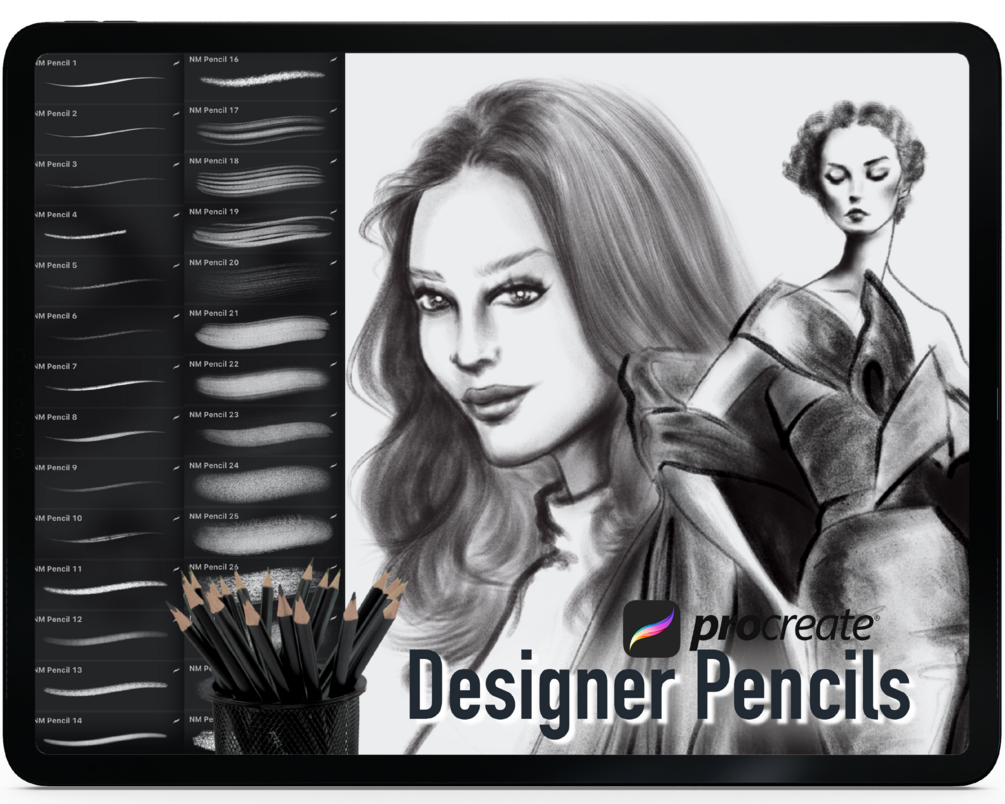 45 Designer Pencils Procreate Brushes, Reaslistic Colored Pencils, Charcoals, Graphite, Hair Brushes.