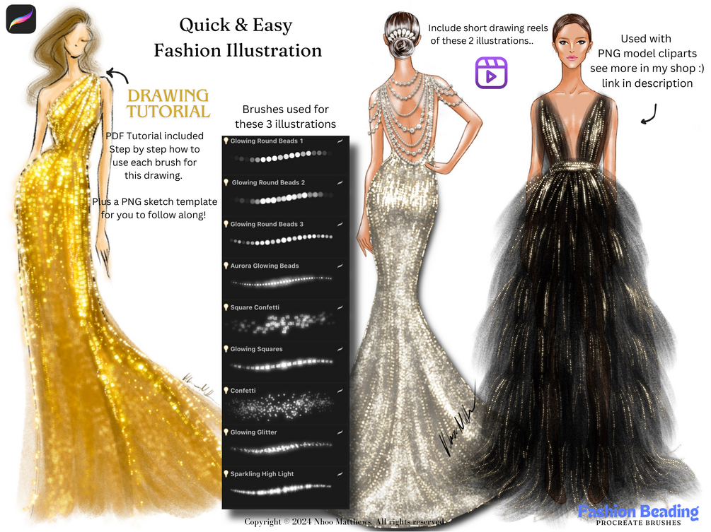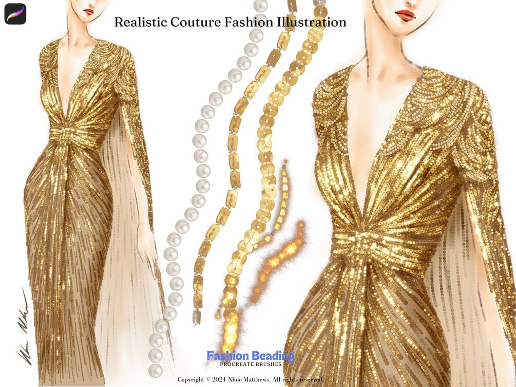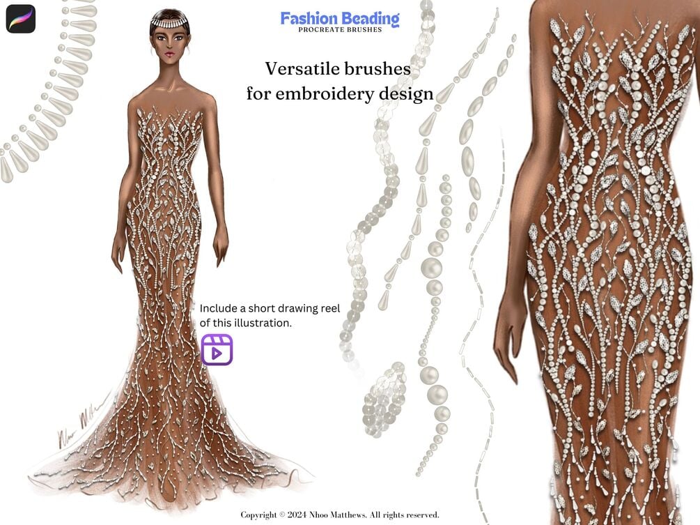 Introducing a new couture embroidery Procreate brush pack! These brushes are developed from my Best Seller Couture Sequin Brushes.There are many common beads which are used in fashion such as sequins, bugle beads, pearls and crystals. The brush settings in this pack are quite versatile. You can create a very realistic fashion illustration, embroidery mockups, or a quick stylized sketch with these brushes. I designed the brushes for all purposes. Additionally, I made a PDF tutorial for you to paint along with me (sketch template included!). I also wrote a blog post dedicated to just for this brush pack.
