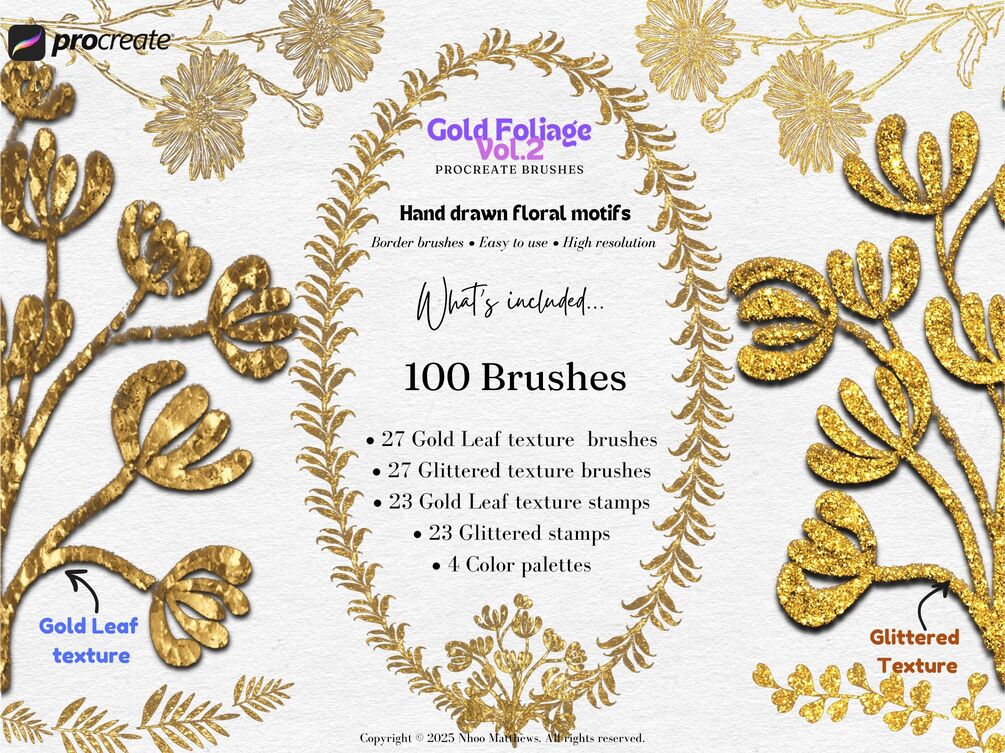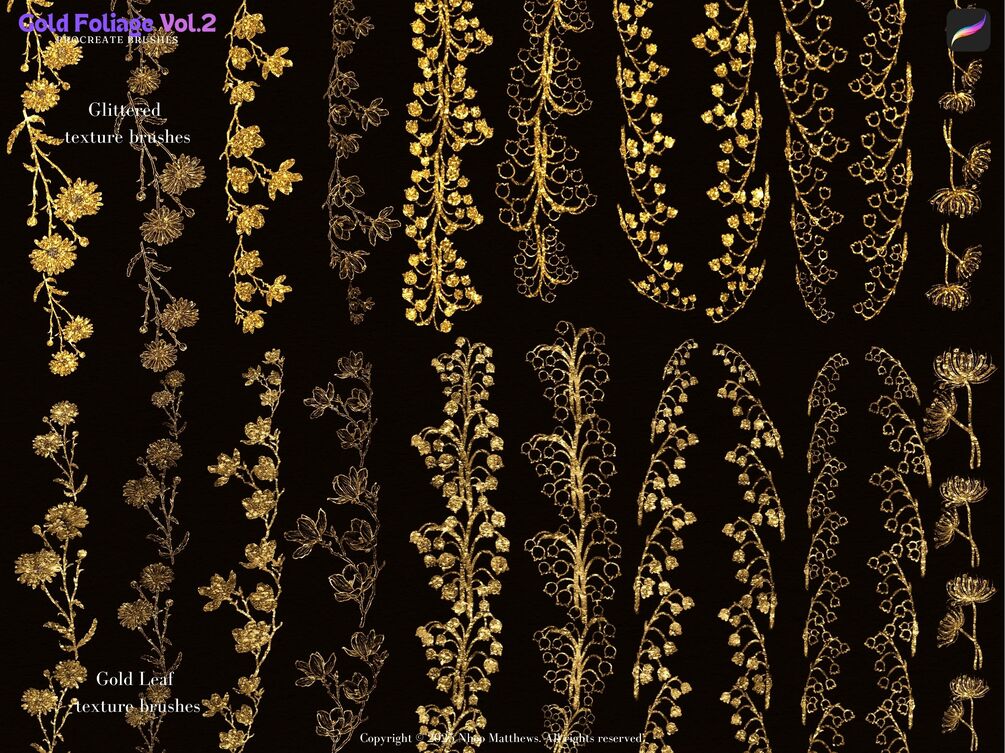 The second brush pack from the Gold Foliage Collection. An elegant gold textured brush pack. Procreate Gold Foliage & Floral border brushes and brush stamps sets (Vol.2) have two metallic textures: Gold Leaf texture, and glittered texture. There are floral designs in this pack, includes lily of the valley, magnolia, daisy, wild flowers, and other whimsical flower motifs. These brushes show a nice high definition texture when used in large size.