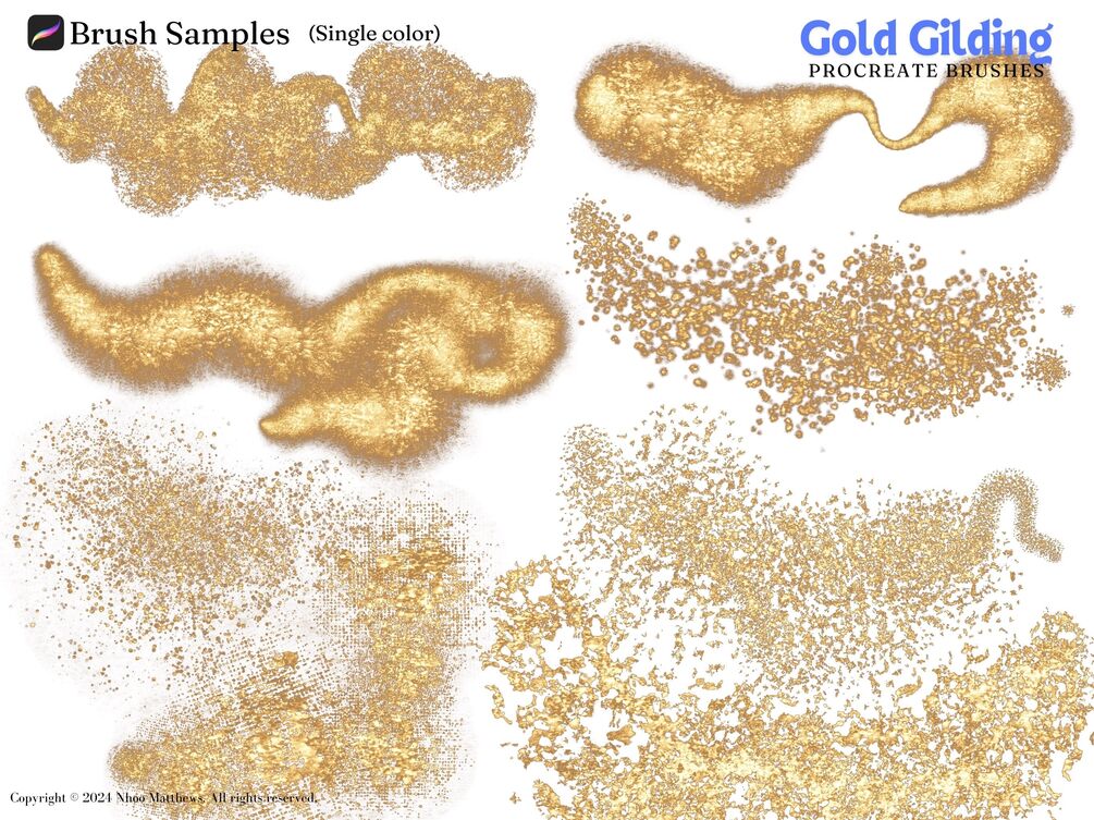 Beautiful Procreate Metallic Brushes in Gold Leaf Gilding theme for your creative projects. Realistic abstract metallic textures, plus custom color palettes of 90 swatches. This brush pack was developed from my best sellers "GOLD LEAF STAMPS" and "LIQUID FOIL BRUSHES" which have been praised by many happy customers's reviews. If you have used my metallic brush collection before, this one is an awesome set to add to your Procreate brush library.