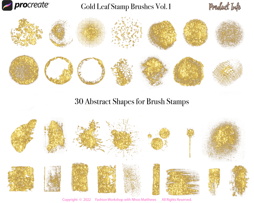 This product offers 30 beautiful high resolution abstract shapes for Gold Leaf Procreate stamps, 60 colors.