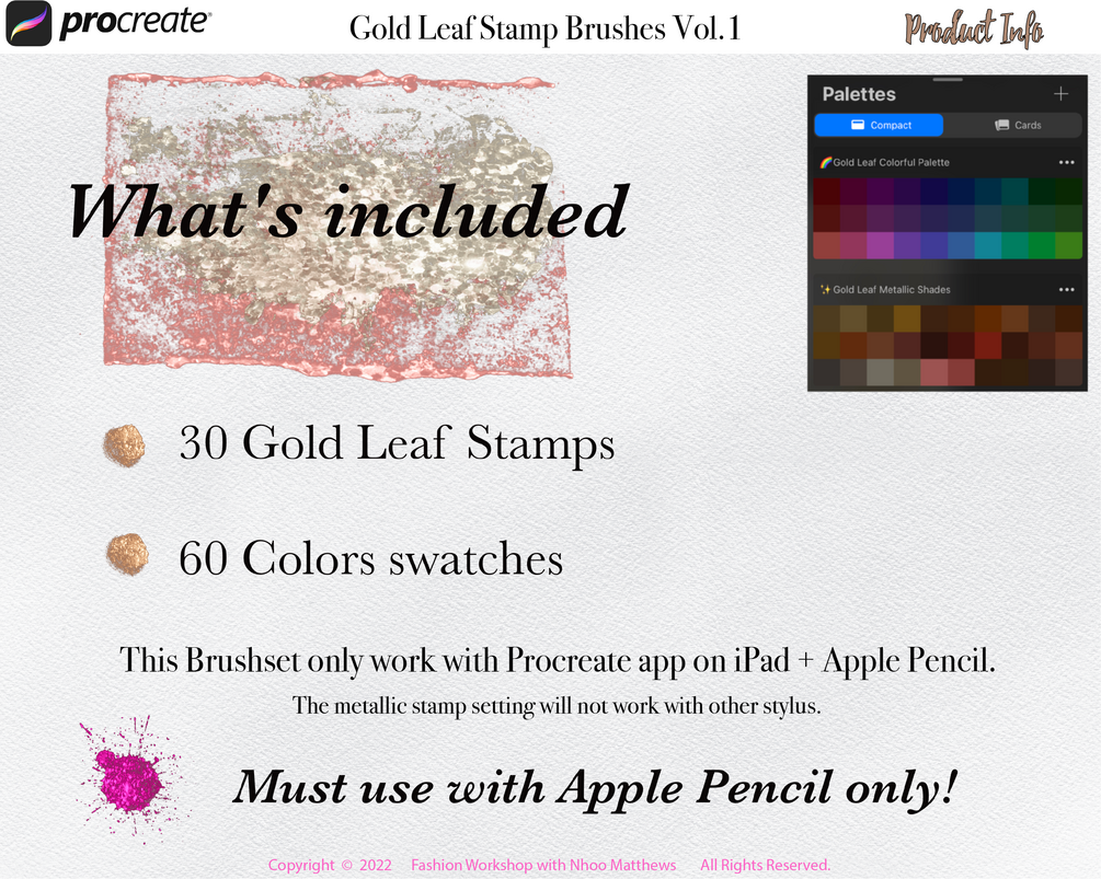 30 GOLD LEAF Stamps Procreate Brushes VOL.1 Gold Metallic Shiny Hot Foil Glitter Textures with 60 colors in palettes.