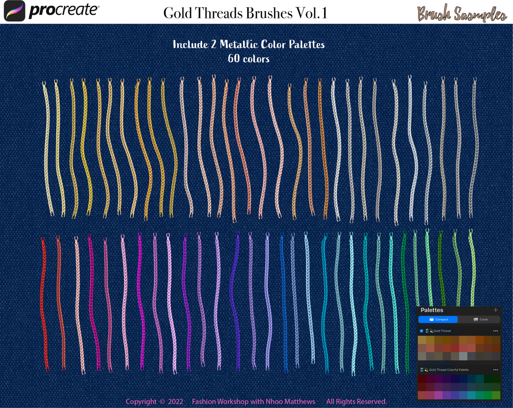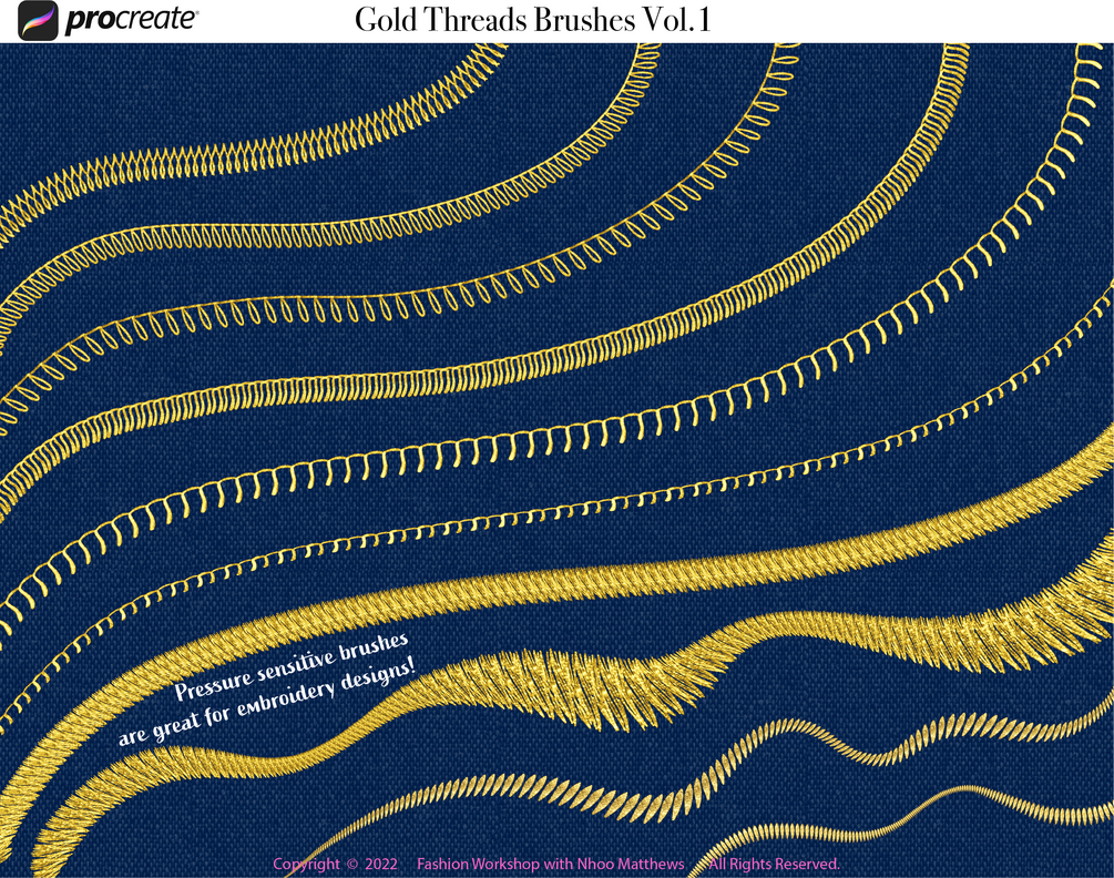 The Original 42 GOLD THREADS Metallic Stitch Brushes for Procreate App. Shiny Embroidery, Cross Stitch, ZigZag, Patterns. VOL.1