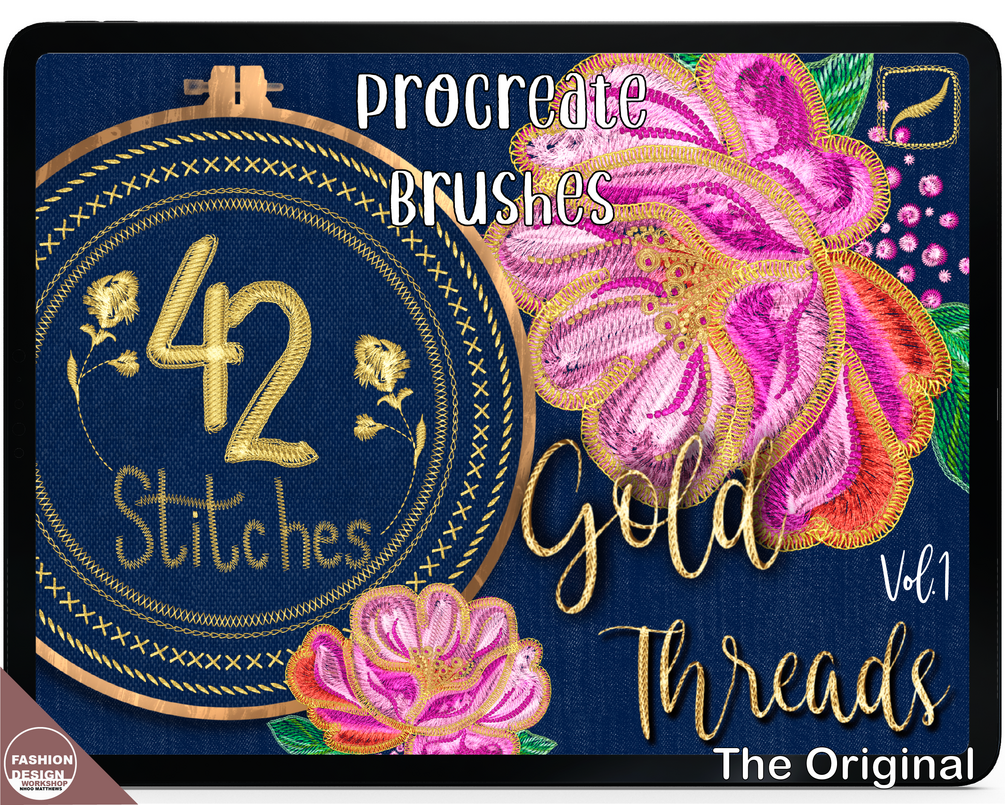 The Original 42 GOLD THREADS Metallic Stitch Brushes for Procreate App. Shiny Embroidery, Cross Stitch, ZigZag, Patterns. VOL.1