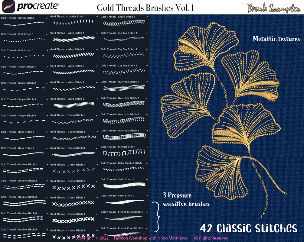 The Original 42 GOLD THREADS Metallic Stitch Brushes for Procreate App. Shiny Embroidery, Cross Stitch, ZigZag, Patterns. VOL.1