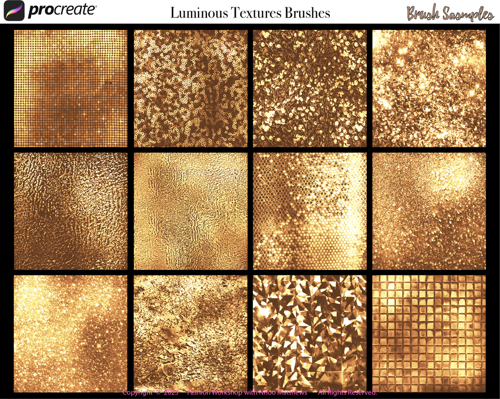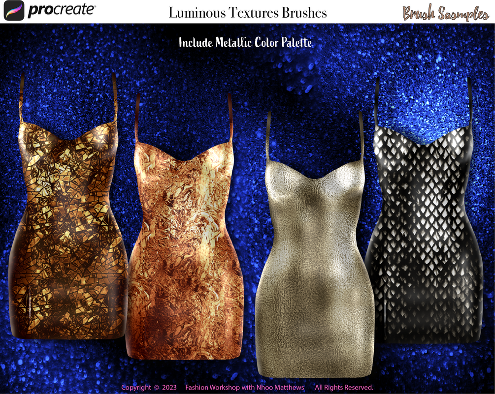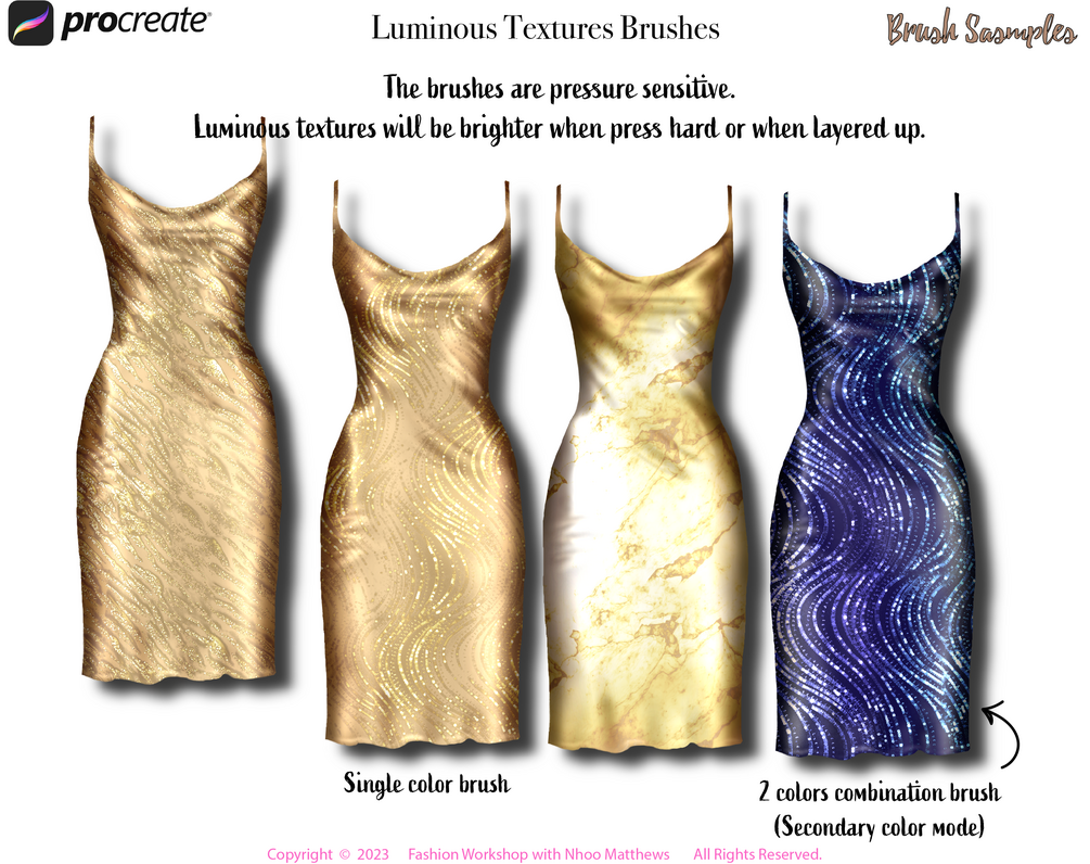 This brush pack is filled with cool and beautiful luminous textures which you can use on many types of art projects. I'm comfortable with fashion drawing so my samples are obviously fashion related 😁 There are different types of texture such as glitter, mosaic, rocks, liquid metal, hammered metal, sequin patterns, satin abstract prints, dragon scales etc. They are all shiny or luminous textures. When you press hard or layered them up, they will be shinier. Questions about the product? Please send a message 🥰