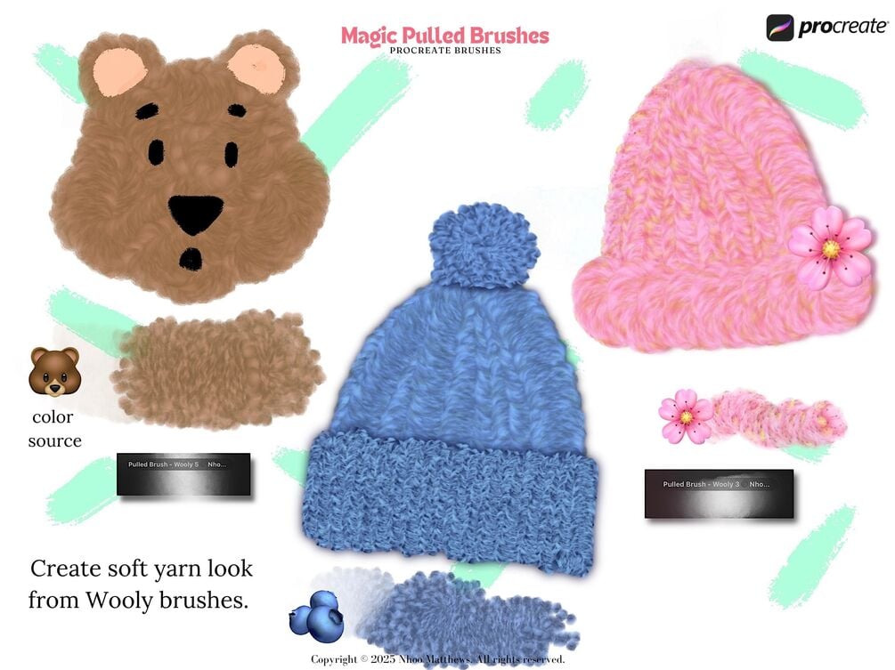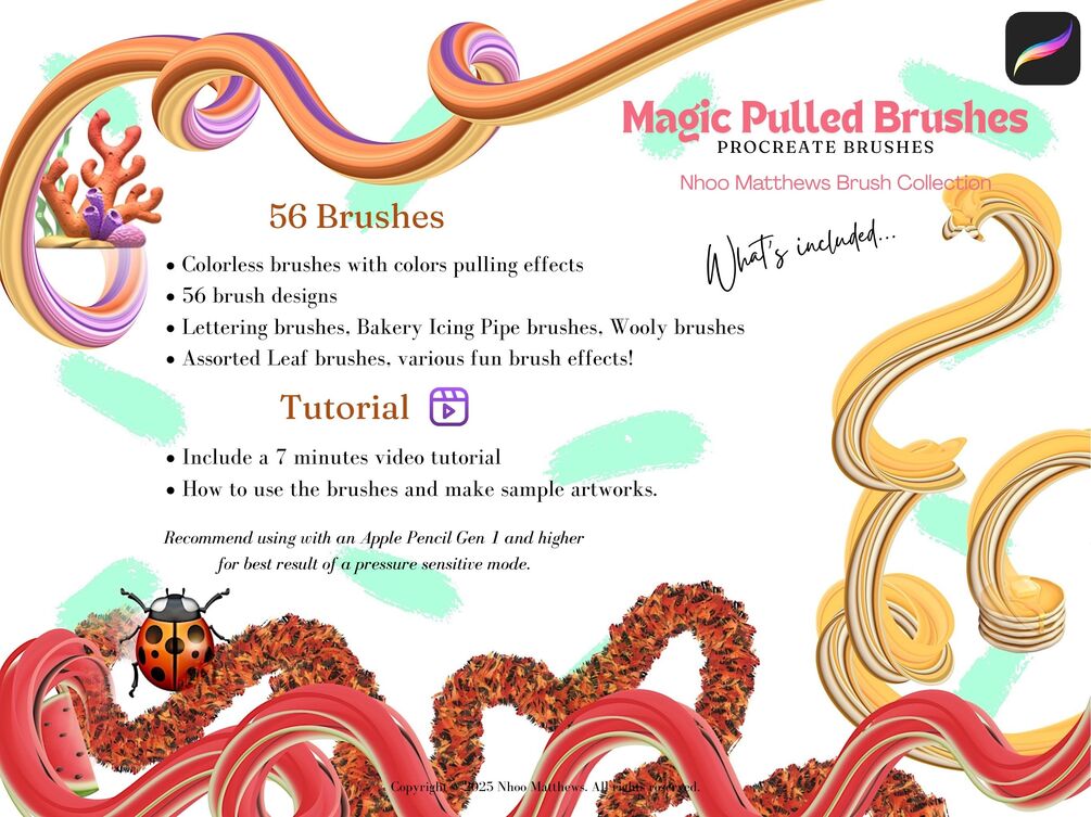 56 pulled brushes + video tutorial. 3D brush effects, pastry brushes, wooly yarn brushes, leaf brushes, lettering brushes.