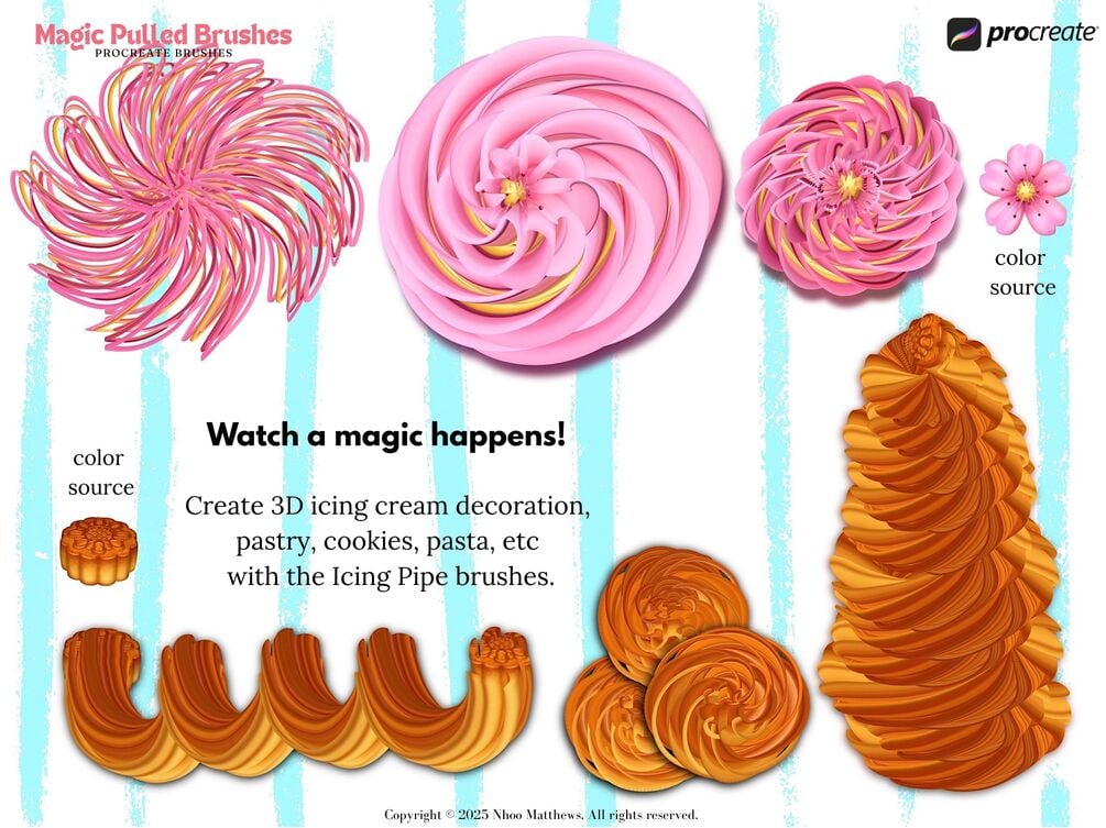 This Procreate Magic Pulled Brushes offer special ability that normal brushes can’t! You can create multicolor – thick 3D effects from these brushes such as a Candy Cane lettering art for Christmas. The brushes are colorless but with colors pulling effects so this allows you to create many colors brush strokes. There is a video tutorial that will explain how it work and how to create some of the artworks from the listing. It’s a perfect “time-killing” product for you and your children! There are various lettering brushes, icing pipe brushes for pastry art, wooly brushes for fluffy yarn or animal theme, pinata brushes, and numerous leaf brushes.