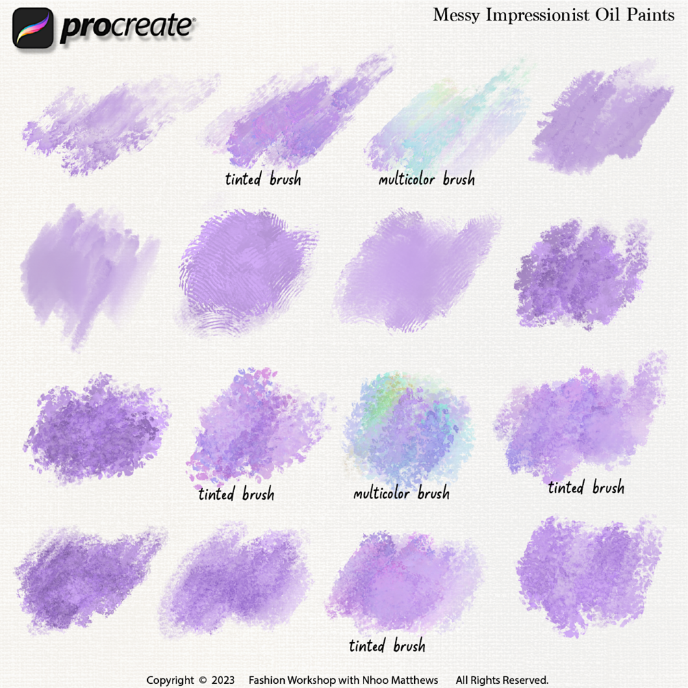 This brush pack was made from my favorite type of art, Impressionism! I'm not at all trained in a traditional fine art but I went to museum a lot when I lived in New York City. My favorite artists are Sargent, Whistler, Renoir, Monet, Van Gogh, Cezanne and Matisse. When I had my couture business, my photoshoot was inspired by Sargent and Whistler's paintings. So, I used one of my photo for a reference drawing to mimic Sargent and Whistler's aesthetic and style. I hope you find my artwork samples help visualize how you can use them in your own art. I created art reels in my Instagram and Tiktok @fashionworkshop.com please see them in action!