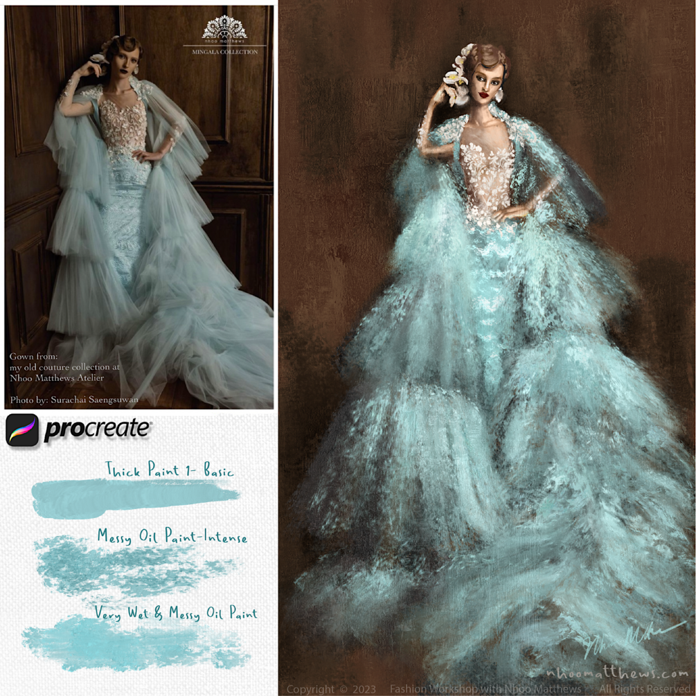 This brush pack was made from my favorite type of art, Impressionism! I'm not at all trained in a traditional fine art but I went to museum a lot when I lived in New York City. My favorite artists are Sargent, Whistler, Renoir, Monet, Van Gogh, Cezanne and Matisse. When I had my couture business, my photoshoot was inspired by Sargent and Whistler's paintings. So, I used one of my photo for a reference drawing to mimic Sargent and Whistler's aesthetic and style. I hope you find my artwork samples help visualize how you can use them in your own art. I created art reels in my Instagram and Tiktok @fashionworkshop.bkk please see them in action!