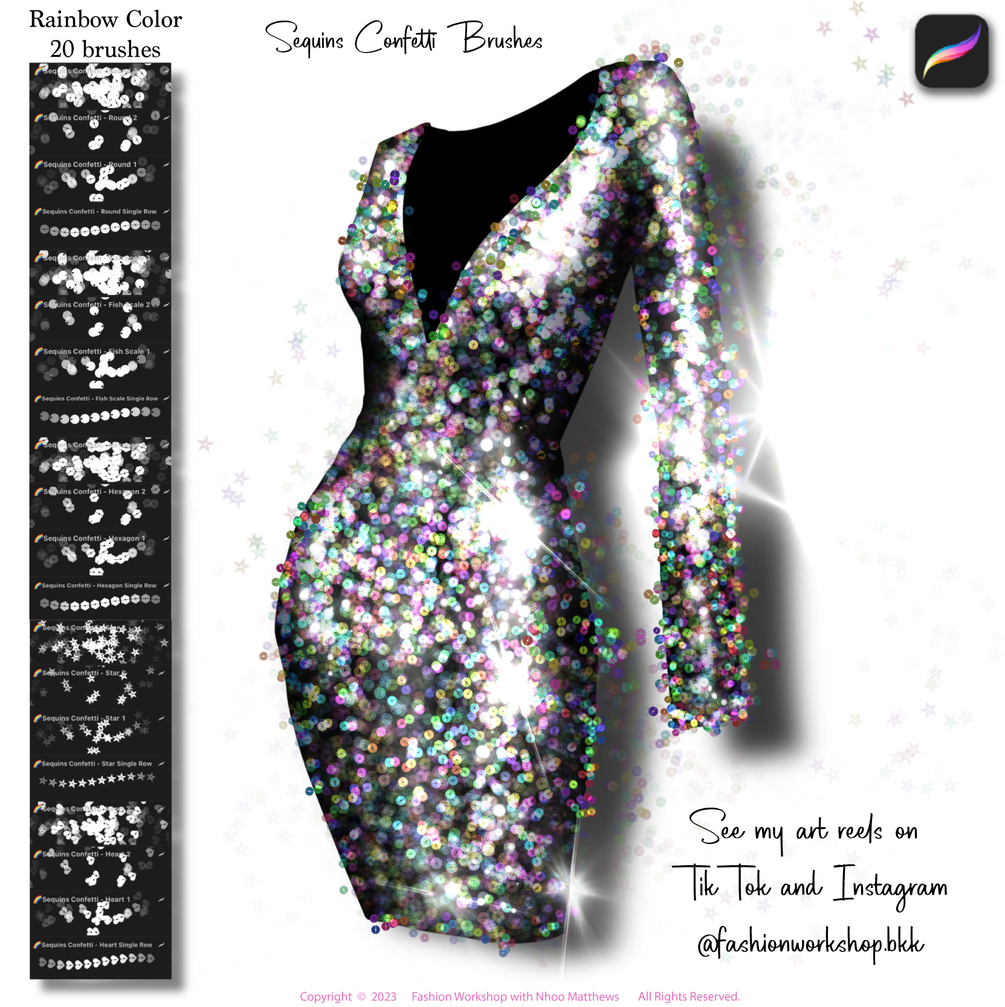 After the first Sequin brush set was released in September 2021, it has been selling well and many designers in Fashion industry used them for their work! Thank you all for your support. My mission was accomplished! Now, two years later, I'm happy to share a new version for easier use! The Sequins Confetti brush pack features 4 amount of sequins, 3 color ways, and 5 common sequin shapes, bring the total to 60 brushes for you to use. I made a PDF eBook Tutorial (14 pages) for this as well.