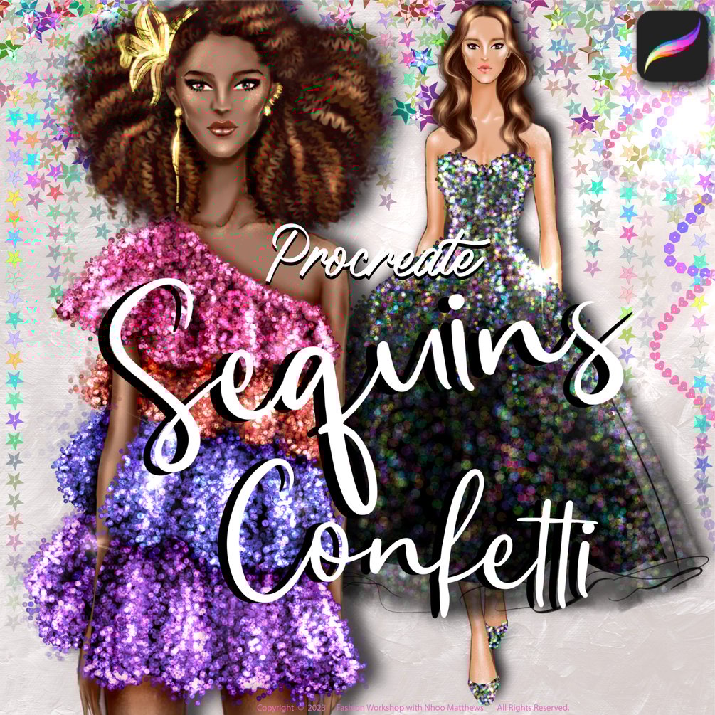 showing you tips and techniques how I created the fashion illustrations for this listing. There are 2 dress designs. Each has its own unique techniques on how to create the realistic sequin textures. Also, a tip of how to work with 3 color values for the Sequin Confetti brushes and color swatches.